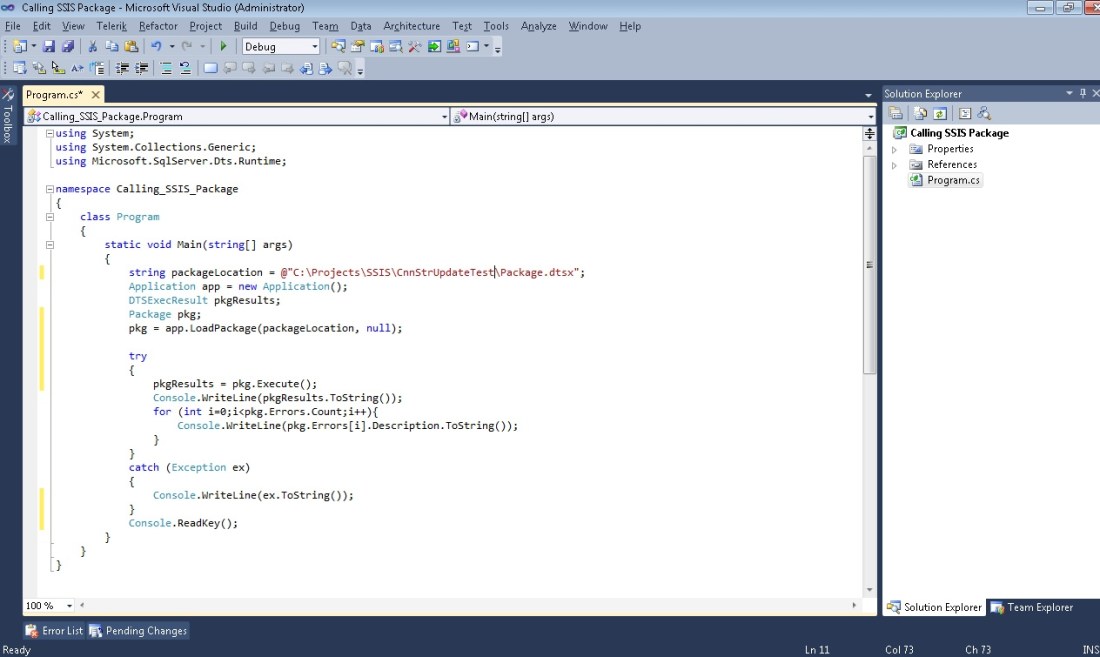 pkg.Connections[1].ConnectionString = “Data Source=localhost;Initial Catalog=DW;Integrated Security=SSPI”;