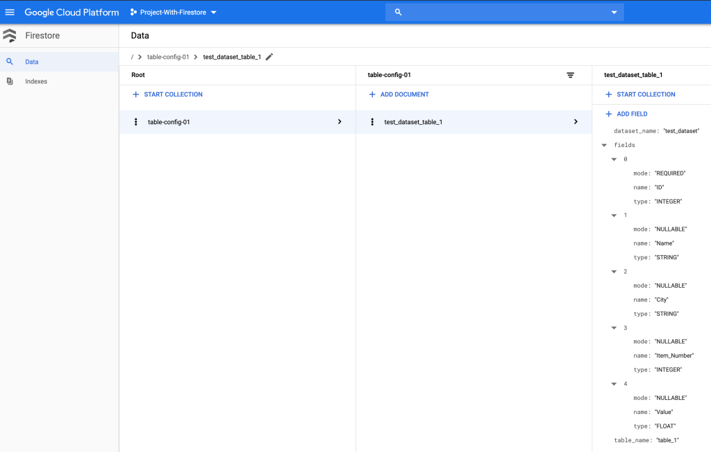 To be able to automate schema evolution on Google Cloud Platform from GCS to BigQuery, we need to have the schema of the BigQuery tables stored in Firestore, which is the document database available on GCP. I went ahead and created a collection in Firestore and stored the my table’s schema in there: