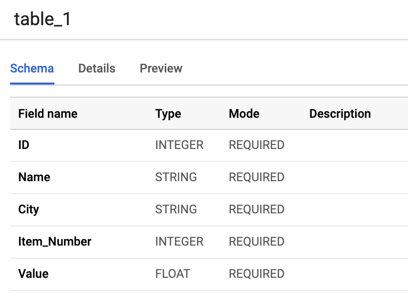 { "tableReference": { "projectId": "project_id", "tableId": "table_id", "datasetId": "dataset_id", }, "schema": { "fields": [ { "name": "column_name", "type": "column_type", "mode": "REQUIRED/NULLABLE" }, ... ] } }